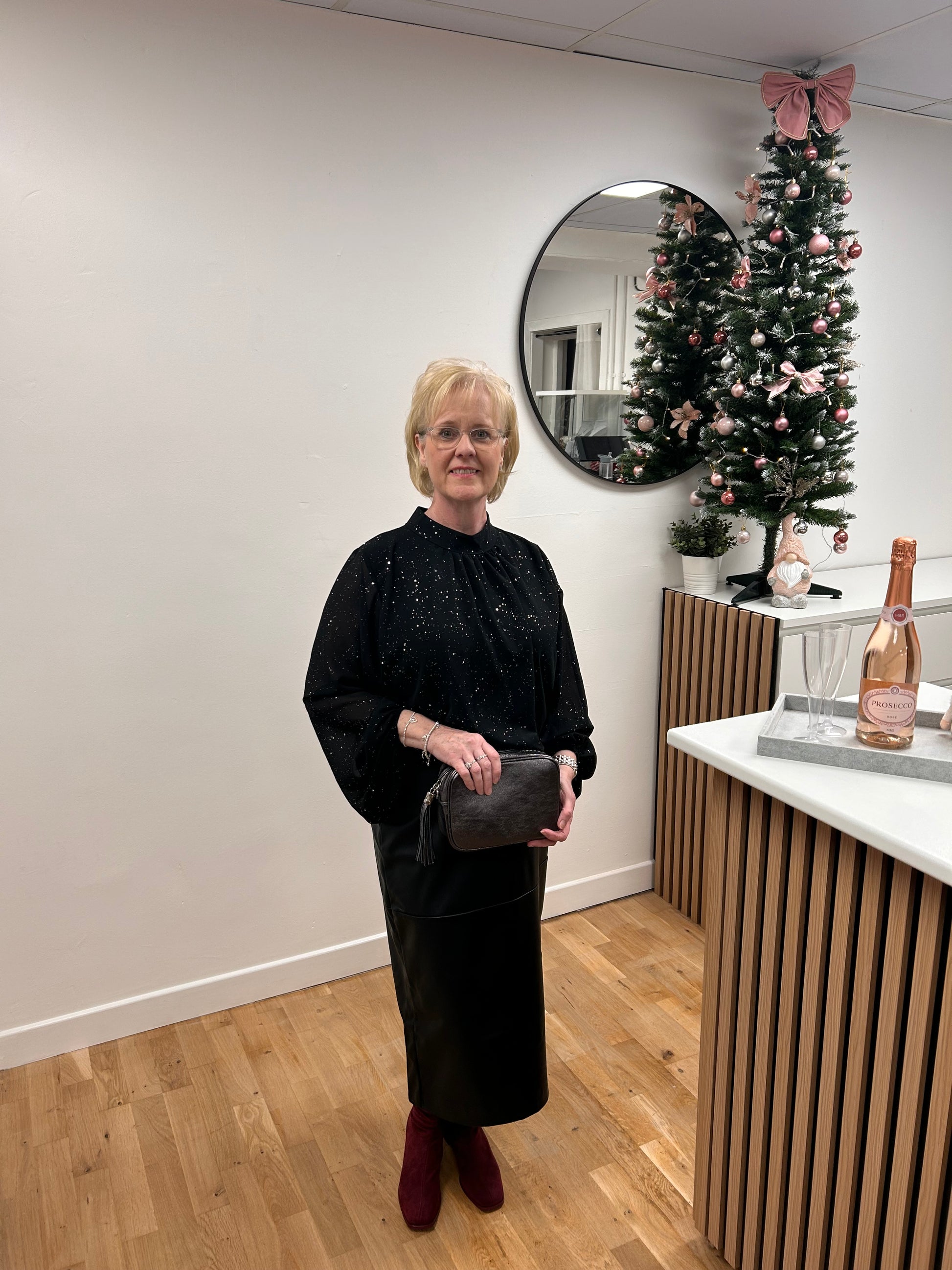 Make a statement at your next celebration in the DOLLY High Neck Blouse. This eye-catching piece features a shimmering sparkly finish that catches the light beautifully, perfect for party season. The elegant high neckline is secured with a distinctive two-button fastening, adding a touch of sophistication to your evening look. Designed in a versatile one-size-fits-all cut to flatter sizes 10-16, this blouse effortlessly transitions from festive gatherings to special occasions. A fresh addition to your occasion wear collection.