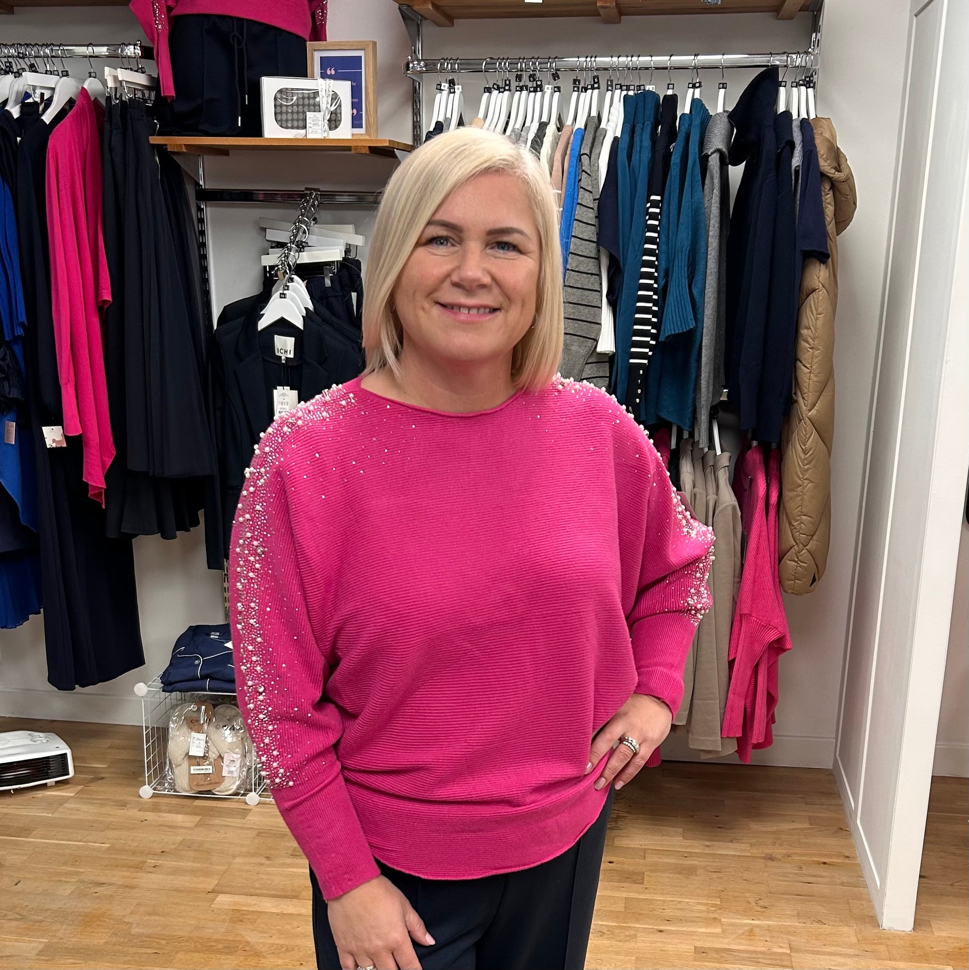 This 'HOLLY' ribbed round neck batwing jumper is perfect for any party setting. Made with a blend of 30% polyamide, 55% viscose, and 15% modal, it offers both comfort and style. The jewelled/sequins details add a touch of glamour, with its batwing design and one size fit making it a versatile and flattering choice.